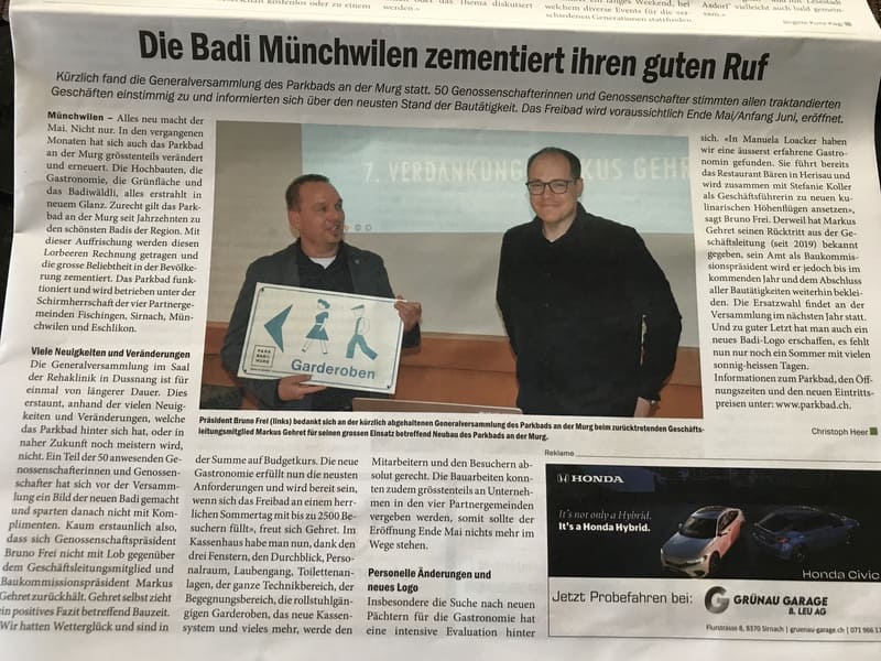 Nach der Begrüssung von Nadja Stricker, Gemeindepräsidentin Münchwilen und Beat Schwarz, Gemeindepräsident Sirnach und der rund 30 anwesenden Interessierten, machte Bruno Frei, Genossenschaftspräsident, einen kurzen geschichtlichen Rückblick und erklärte, wie es überhaupt zur Genossenschaft Parkbad an der Murg und schliesslich zur heutigen 65 Jahre alten Badi kam.