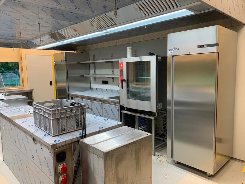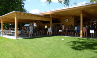 Rechts: Blick auf den neuen Gastronomiebereich mit grosszügiger Ausgabe und überdachten Sitzgelegenheiten