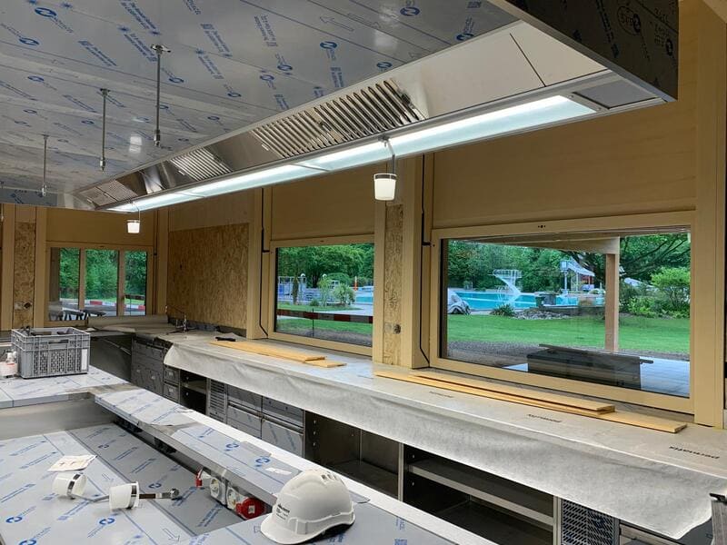 Frei und Gehret wenden sich der südlichen Seite des Neubaues zu. Hier entstehen der Kassenbereich und der Gastrobetrieb mit Platz für bis zu 80 Gäste. Vor allem für die Gastronomie haben sich die Verantwortlichen viele Gedanken gemacht. Frei merkt an, dass nicht nur eine schöne Badi-Anlage punkte, sondern auch ein gutes Gastroangebot.