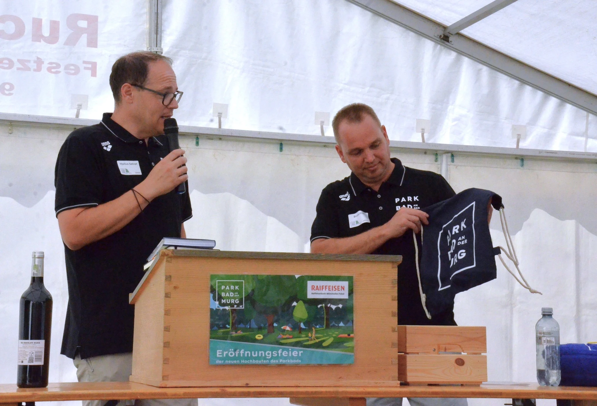 «Als Präsident der Genossenschaft Parkbad an der Murg ist es mir eine Ehre, heute unsere neuen Hochbauten einzuweihen. Da dürfen natürlich Vertreter unserer vier Vertragsgemeinden Eschlikon, Fischingen, Sirnach und Münchwilen nicht fehlen. Aber auch Mitglieder der vier Schulgemeinden, ehemalige Präsidenten, Geschäftsleitungsmitglieder, Sponsoren, Planer, Architektinnen, Bauleiter und Berater gehören zu unserer tatkräftigen Mannschaft. Ohne sie stünde das Parkbad heute nicht da, wo es ist», sagt Bruno Frei.