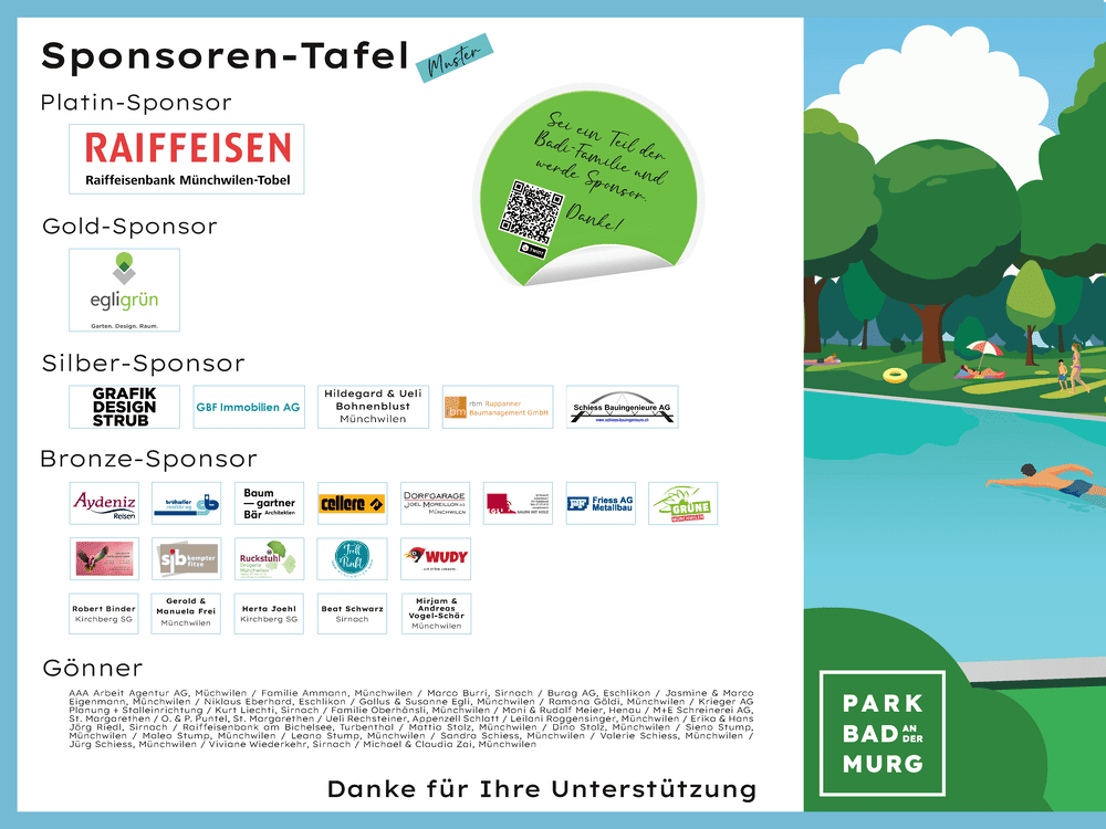 Als Sponsor des Parkbades werden Sie ein sichtbarer Teil der grossen Badi-Familie und tragen dazu bei, die Ziele und Visionen der Genossenschaft zu verwirklichen. Wir würden uns sehr freuen, wenn eines unserer Angebote Ihr Interesse weckt. Gerne erläutern wir Ihnen in einem persönlichen Gespräch die Einzelheiten und verschiedenen Werbemöglichkeiten.